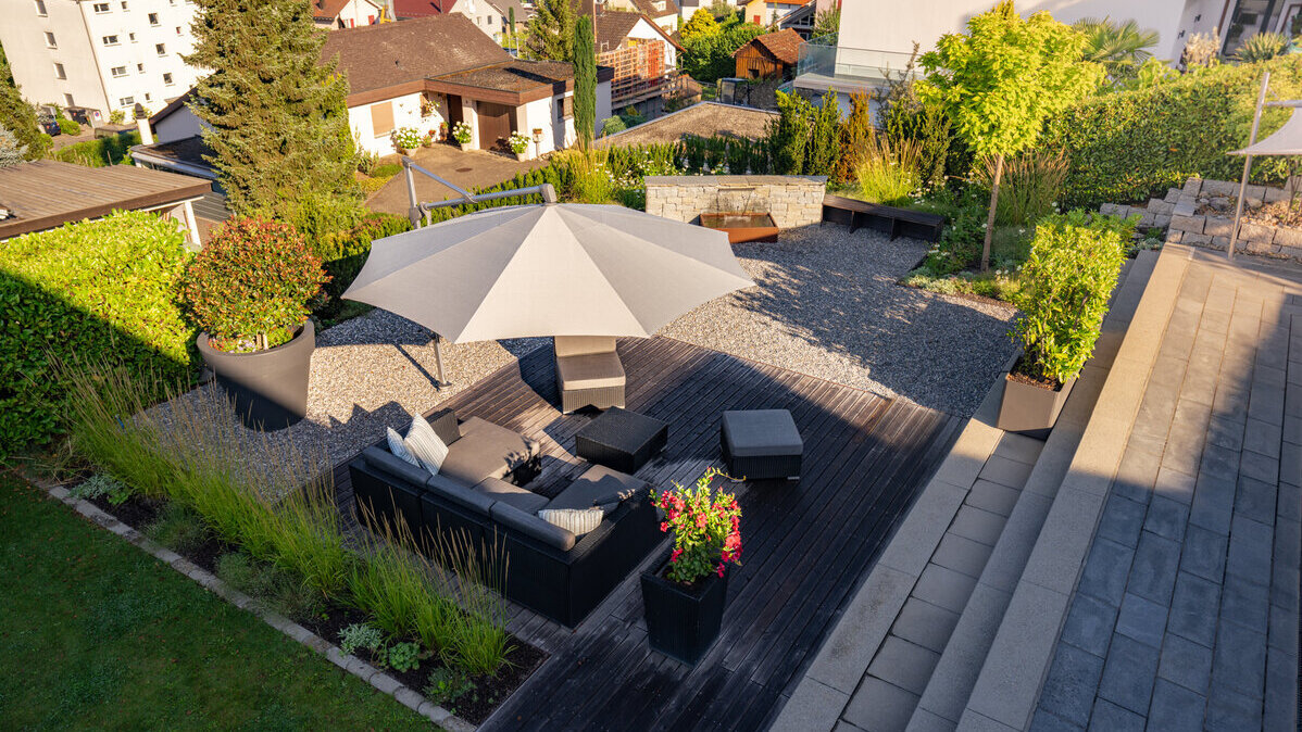 Ein neues Wohnzimmer wurde hier dem bestehenden Garten angefügt. Der Holzrost gibt dem Loungebereich einen angenehmen Belag. Die Natursteinmauer aus Luserna Gneis, welche dem Brunnen einen tollen Charakter gibt und dann in die Sitzbank übergeht, bildet den Blickfang des Gartens. Mit einer wertvollen Staudenbepflanzung wird das neue Wohnzimmer eingerahmt und besticht durch immer wieder neue Blüten.