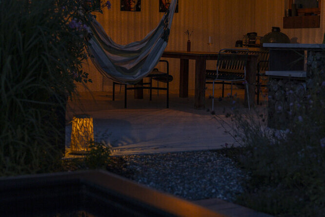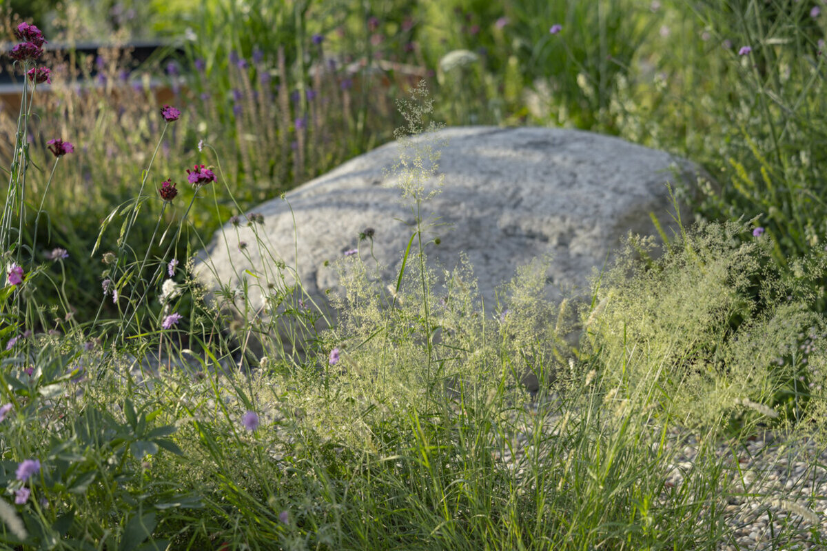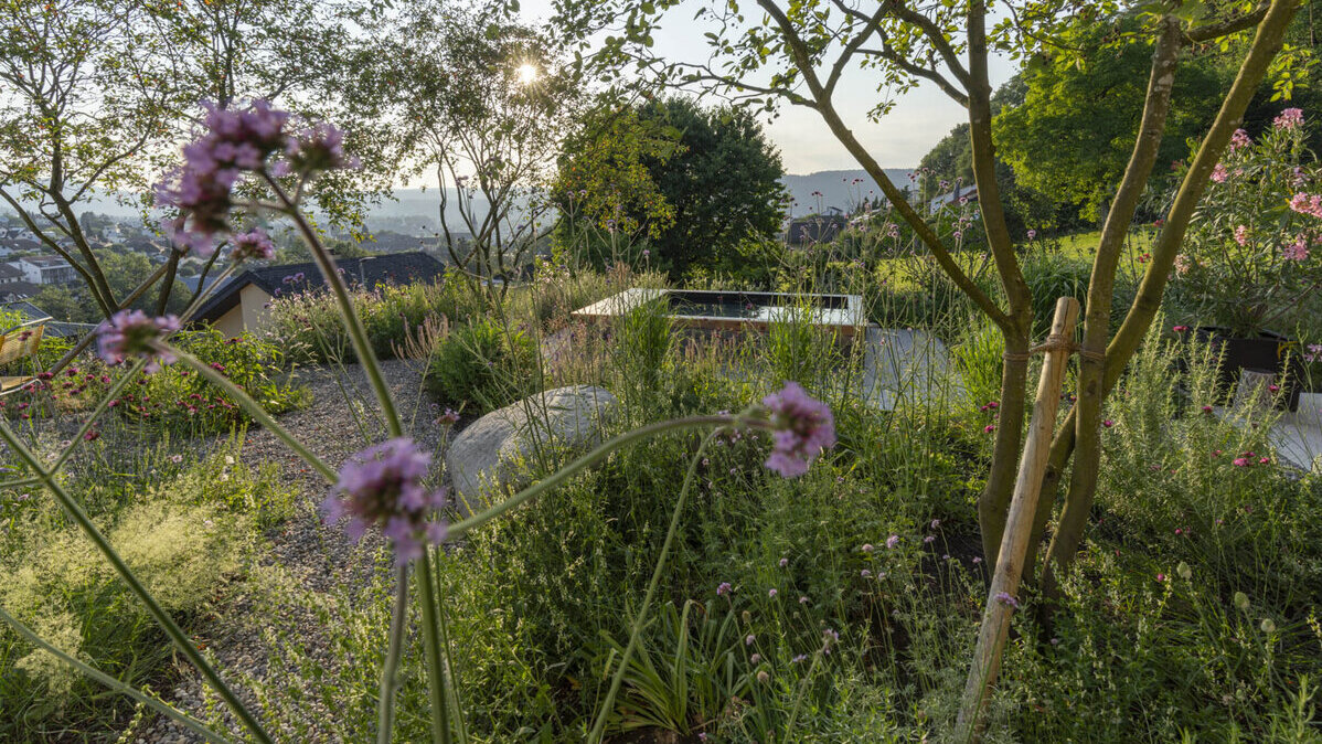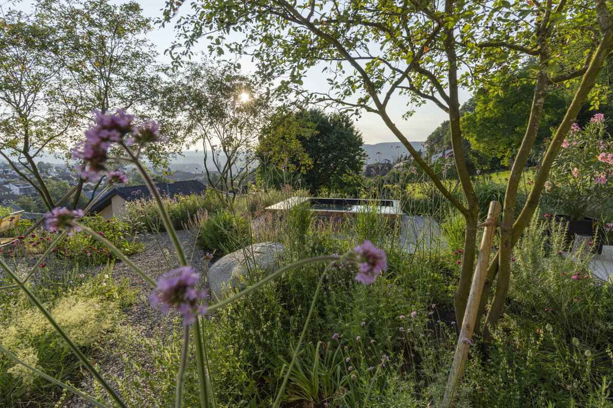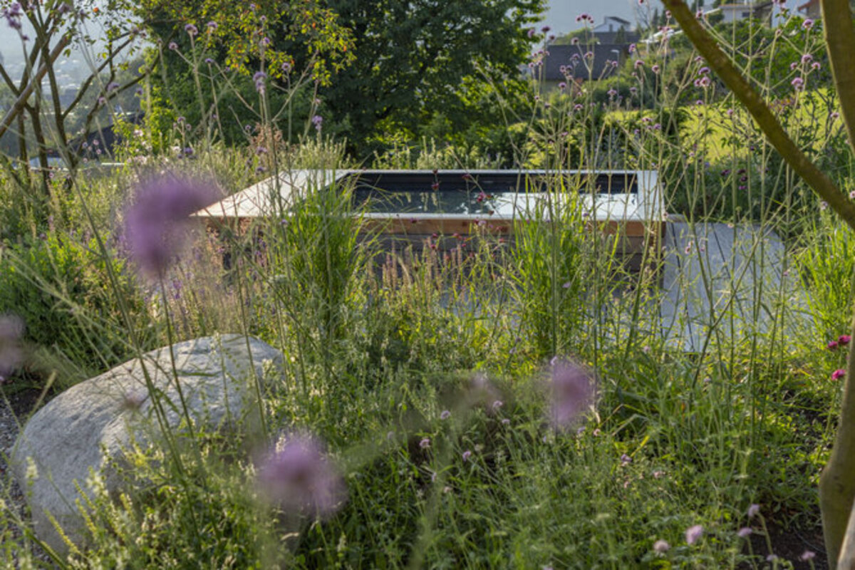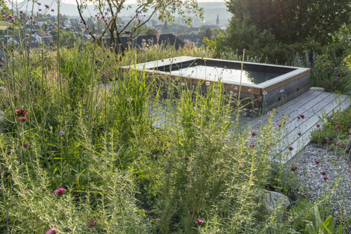Ein Garten voller Leben – mit einheimischen Blütenstauden, klaren Linien und einem biologisch gereinigten Badebrunnen, der zum Eintauchen einlädt.
