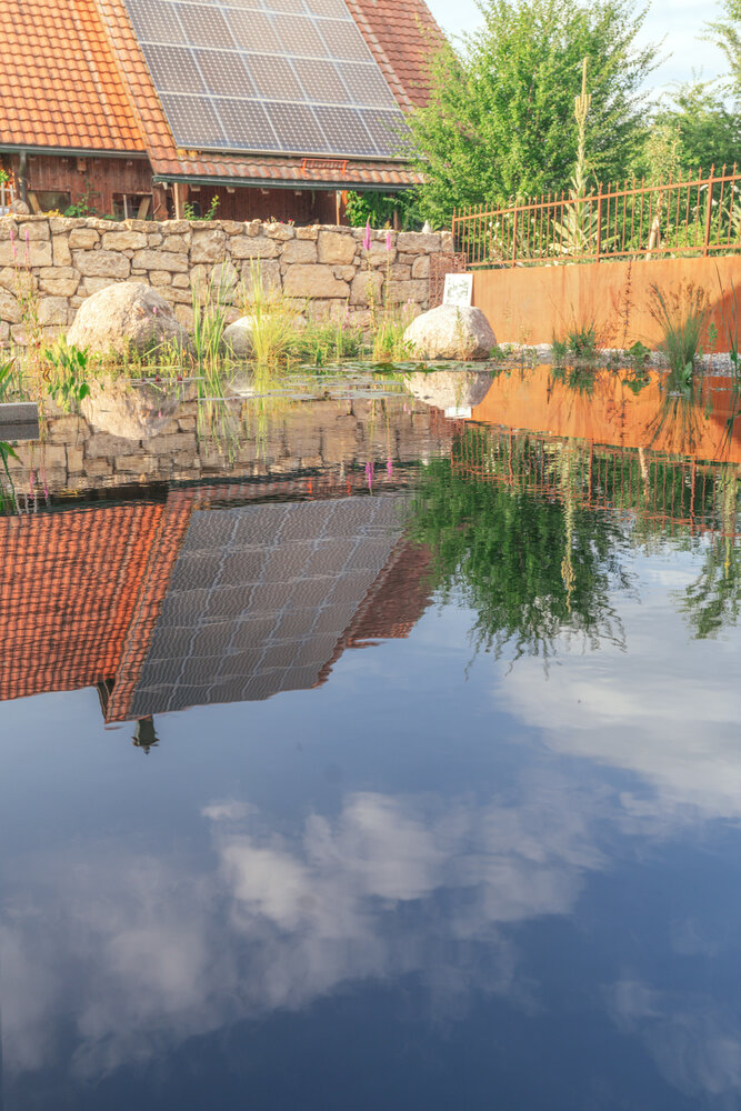Ein Naturgarten aus dem Bilderbuch, mit dem Schwimmteich als Mittelpunkt. Ein Element, welches ein ganz besonderes Badeerlebnis bietet und durch seine grosse Artenvielfalt begeistert. Ab ins kühle Nass und tolle Gartenstunden erleben.